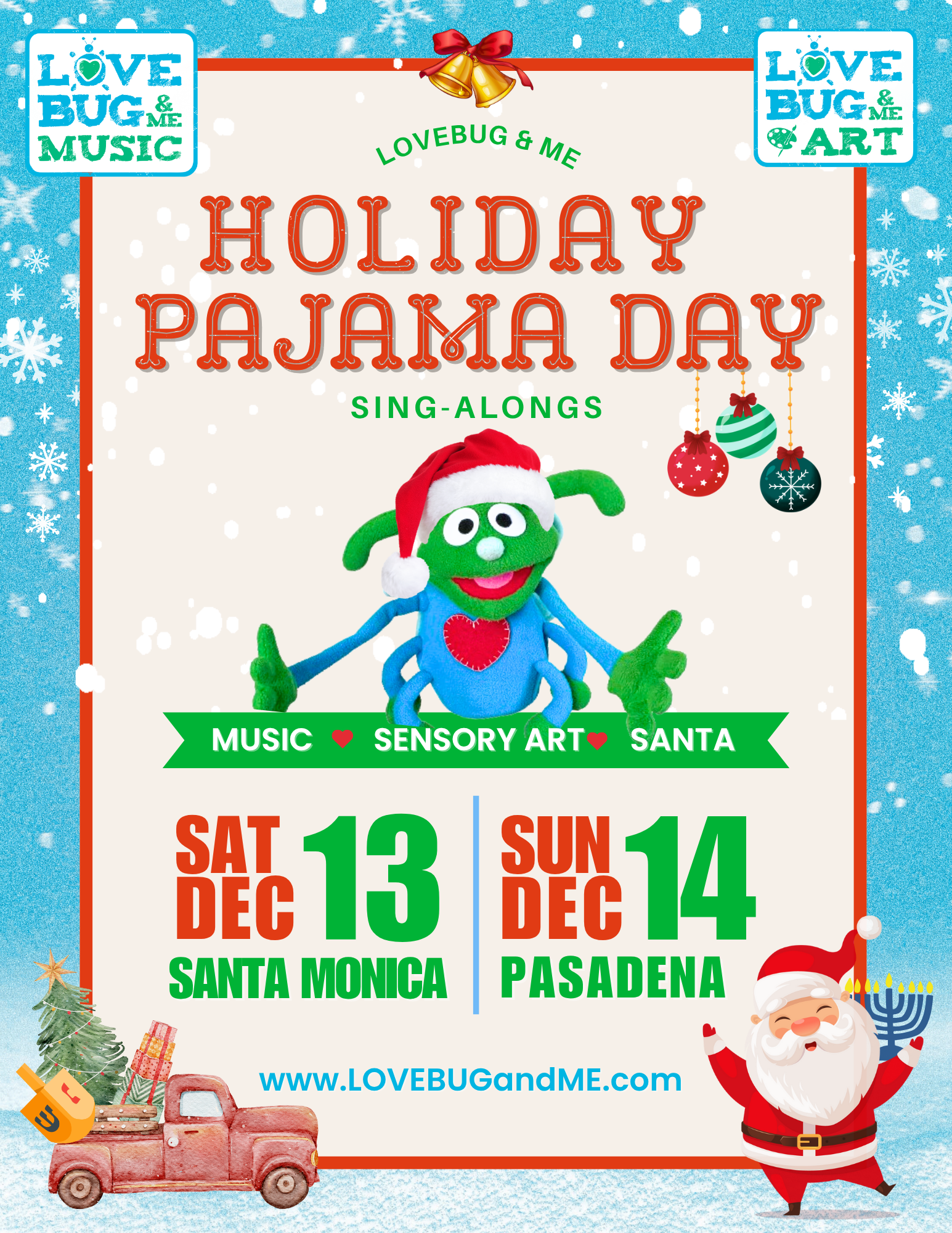 Join our magical December Holiday Pajama Day Sing-Alongs for lovebugs ages 0-5! Sing, dance, and celebrate the season with LoveBug & Me with an appearance by our very specia